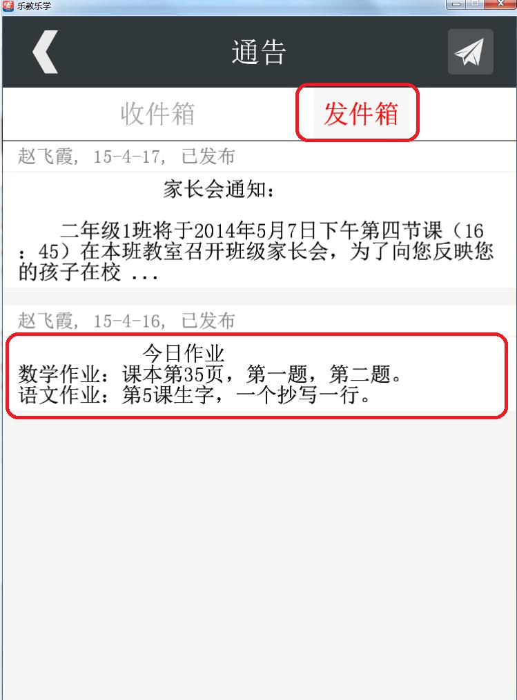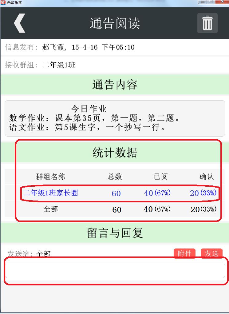 在留言与回复区,可以就通告补发一内容,回复家长、学生的提问。